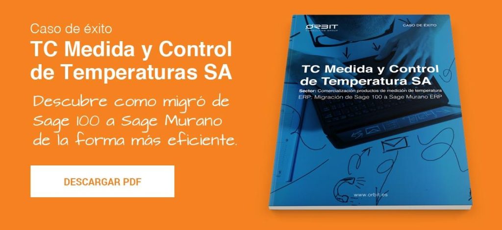 Madrid, 17 de junio de 2015.- Orbit Consulting Group, compañía desarrolladora de sistemas y soluciones TI para las Pymes, ha llevado a cabo la migración de la herramienta de gestión empresarial Sage 100 a Sage Murano ERP en la empresa comercializadora de productos para la medición de temperatura TC Medida y Control de Temperatura SA (TC SA). Con esta actualización, TC SA ha obtenido unas mejoras en la visibilidad de la información corporativa y una sencillez de uso que le han permitido aumentar su productividad.